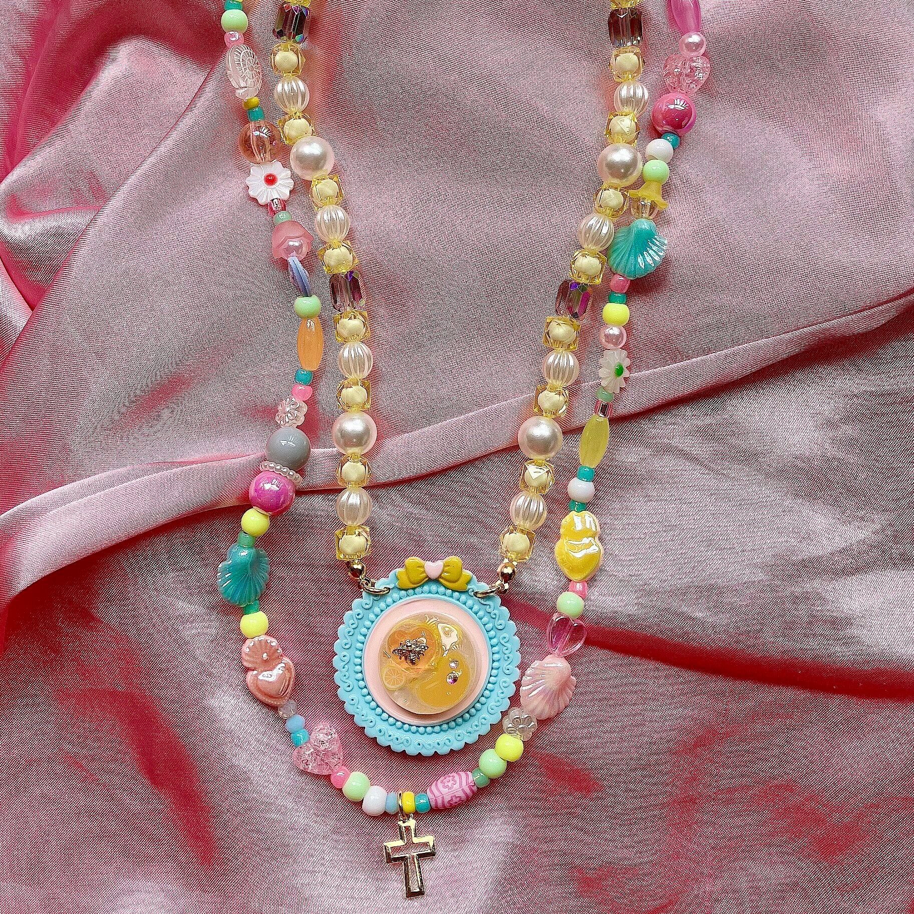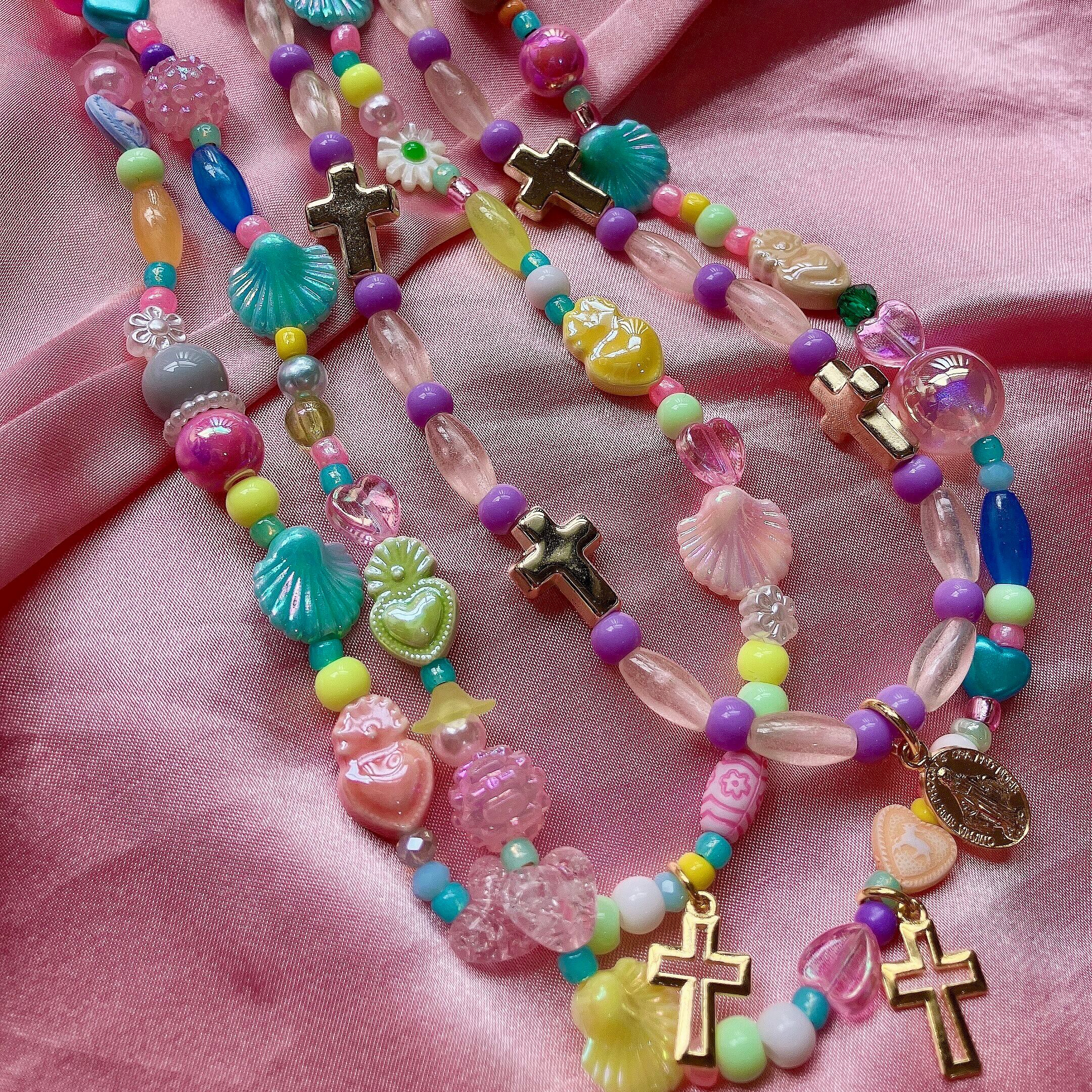 パステルカラーを基調とした十字架チャームのビーズネックレス。