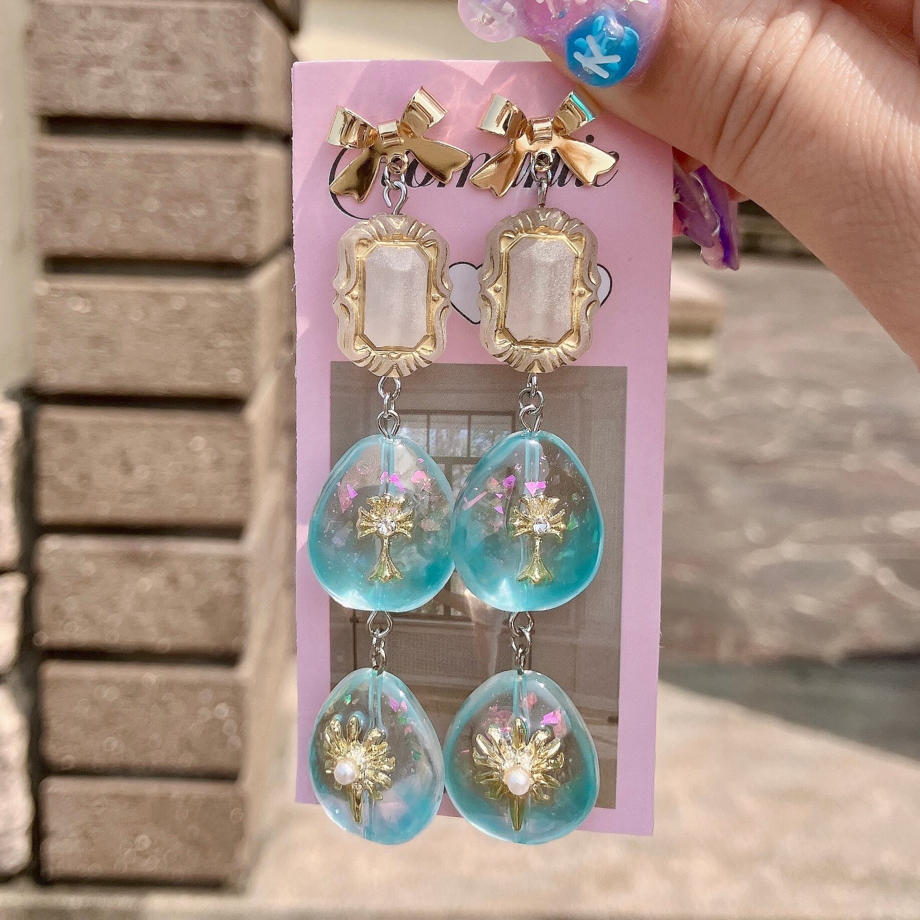 ゴールドのプチリボンに磨りガラスのようなフロストビーズ、淡いブルーに色付けしたドロップ型のビーズが揺れ動きます。