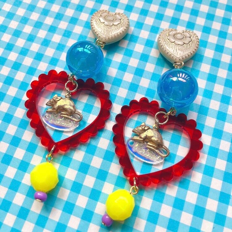 アンティーク調のハートのビーズにうるうる感がたまらない水色のボールビーズ、クリアレッドのハートフレーム、イエローの多角ボールを縦に連ねたイヤーアクセサリー。