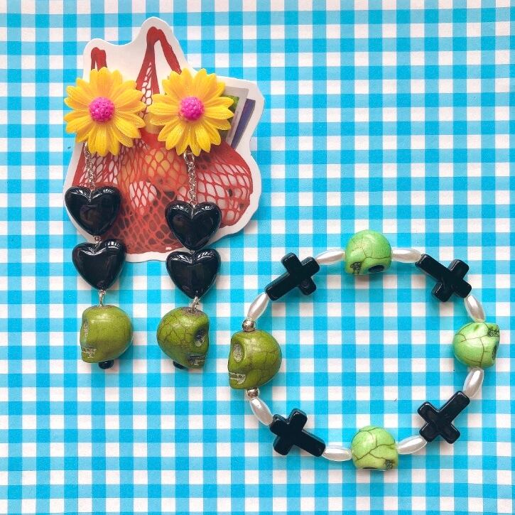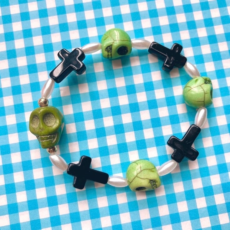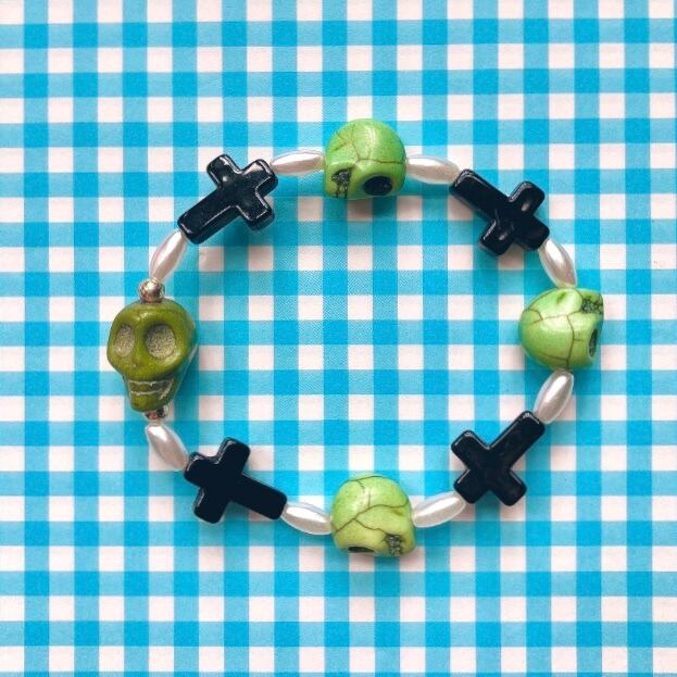 大小の頭蓋骨ストーンビーズに細身のパールや十字架ビーズを連ねたビーズブレスレット。