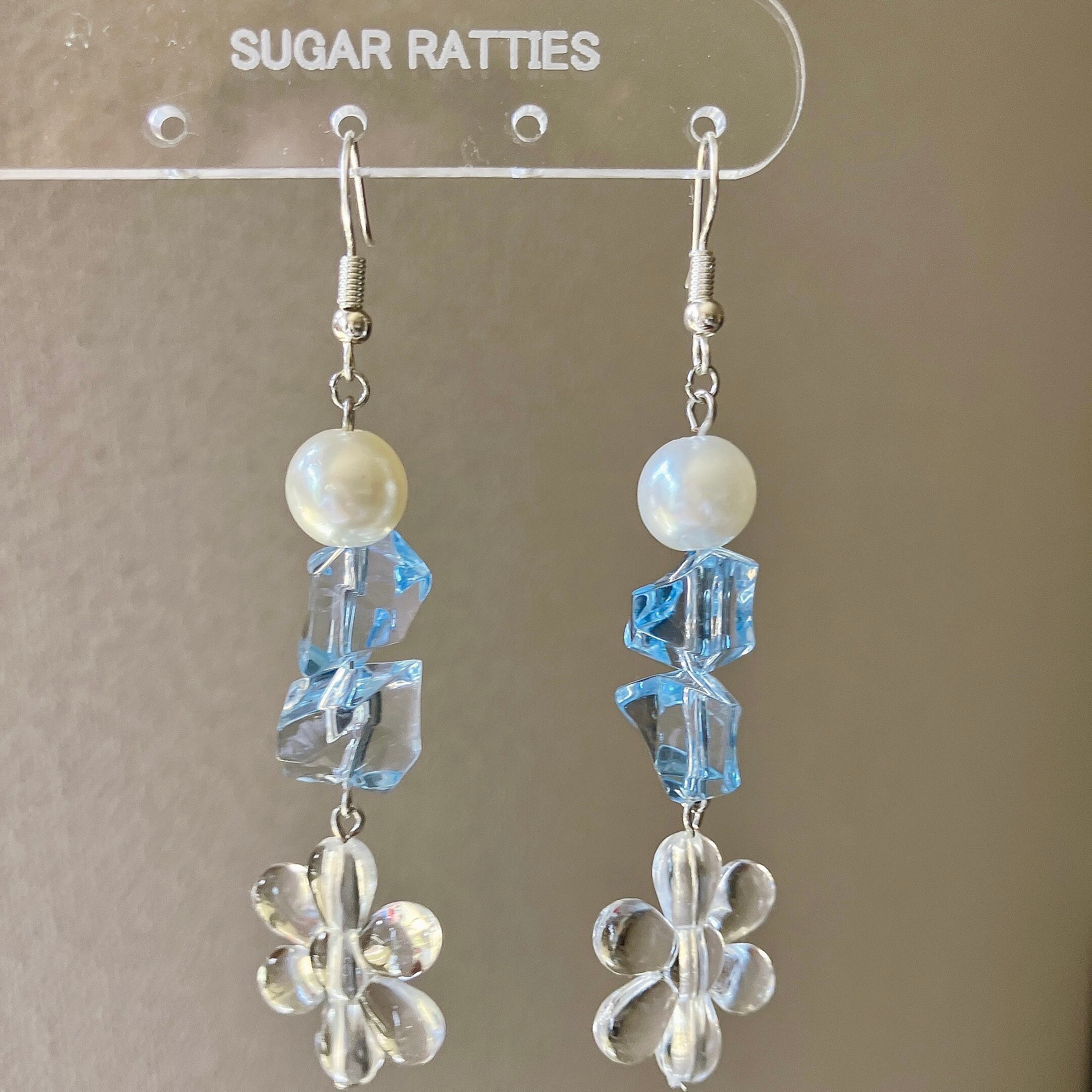 パールに氷のようなビーズ、おおぶりなお花のビーズが揺れるイヤーアクセサリー。