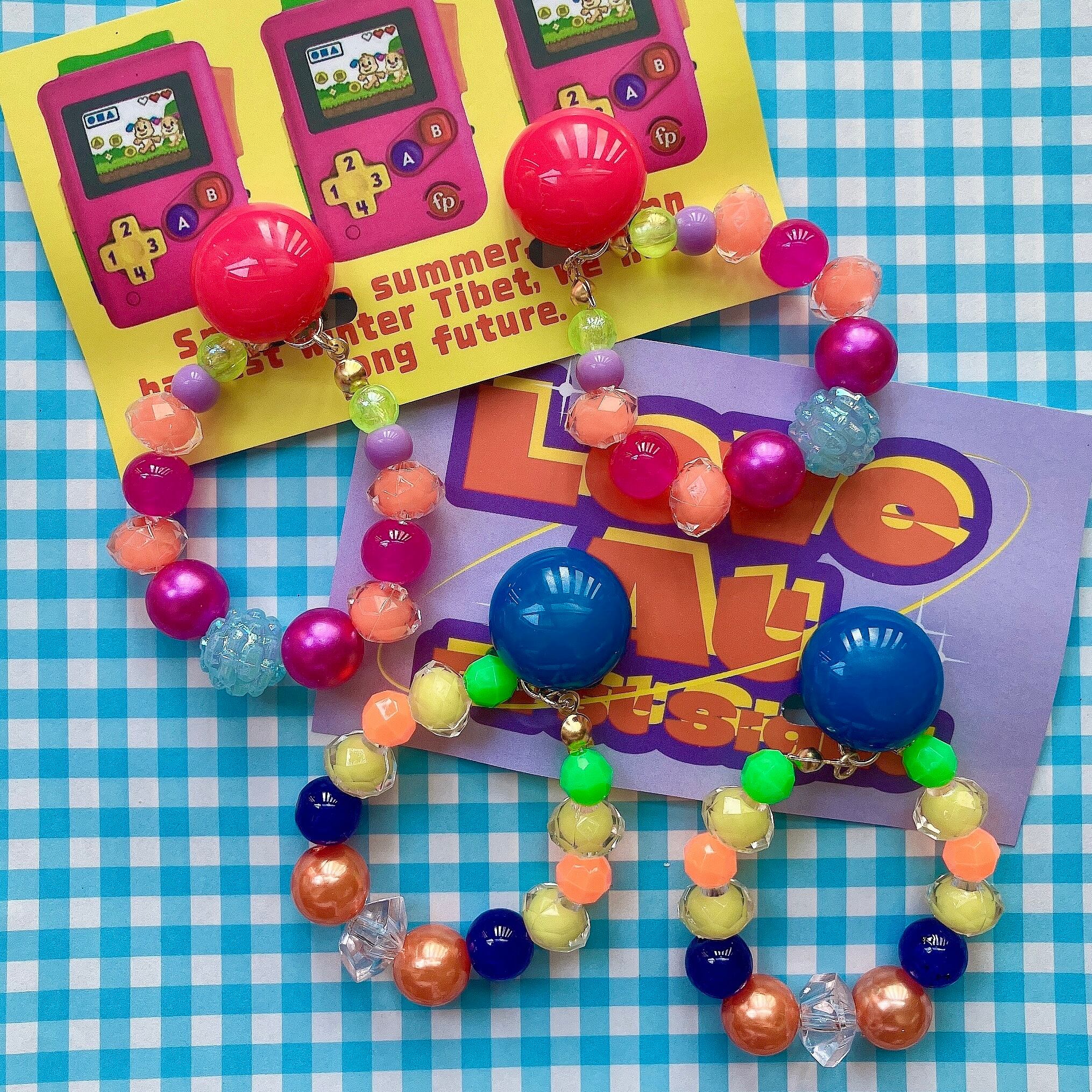 カラフルなカボションにビーズの輪っかが揺れるイヤリング。
