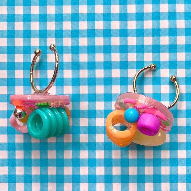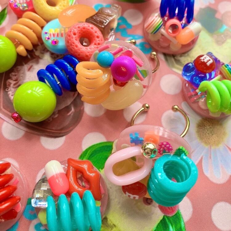 樹脂スプリンクルを封入した平丸レジンパーツに、デコパーツやビーズを盛り付けたデコラティブなリング。