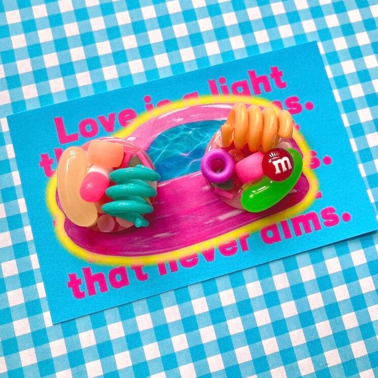 樹脂スプリンクルを封入した平丸レジンパーツに、デコパーツやビーズを盛り付けたデコラティブなイヤーアクセサリー。