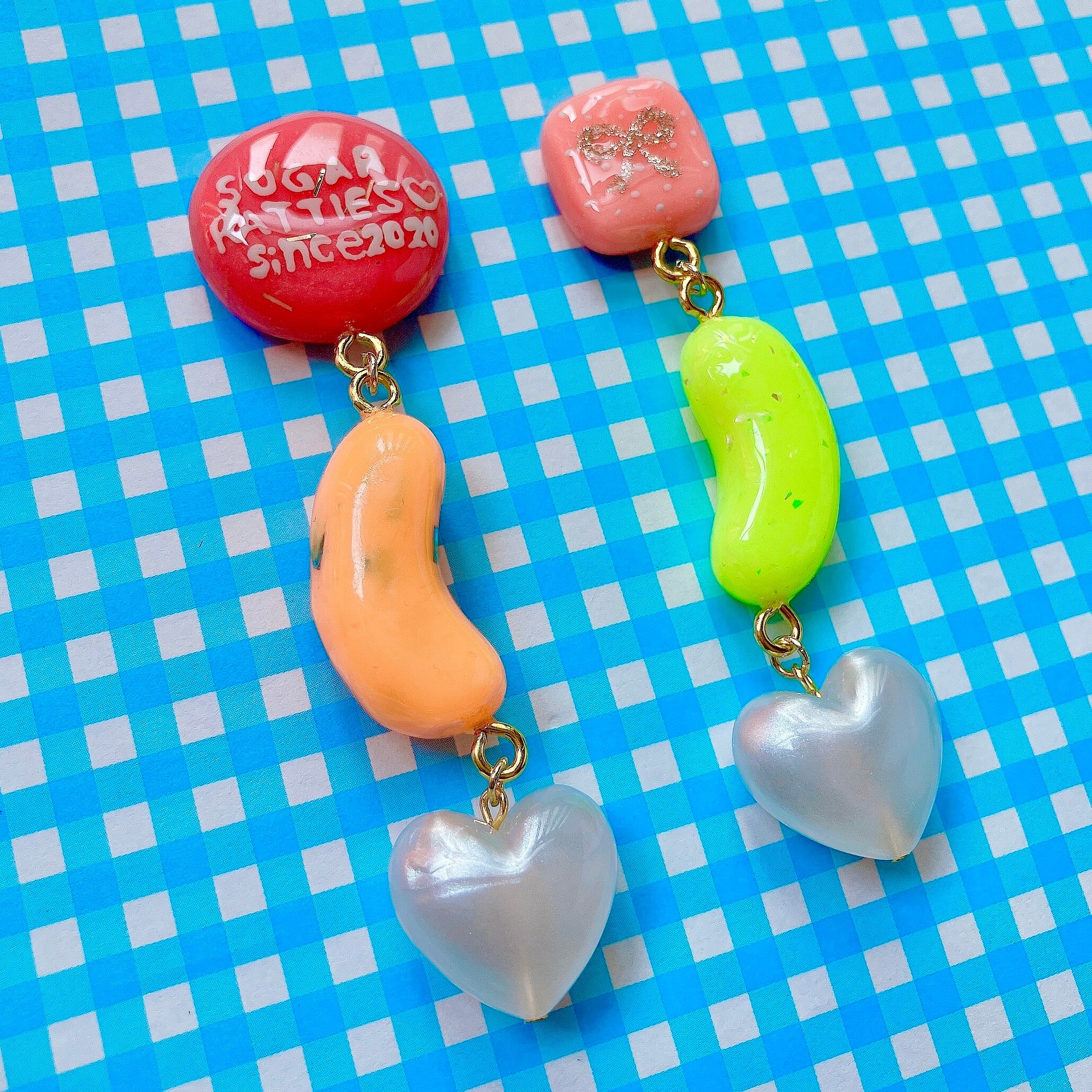 不揃いな粘土パーツとハートのビーズを組み合わせたイヤーアクセサリー。