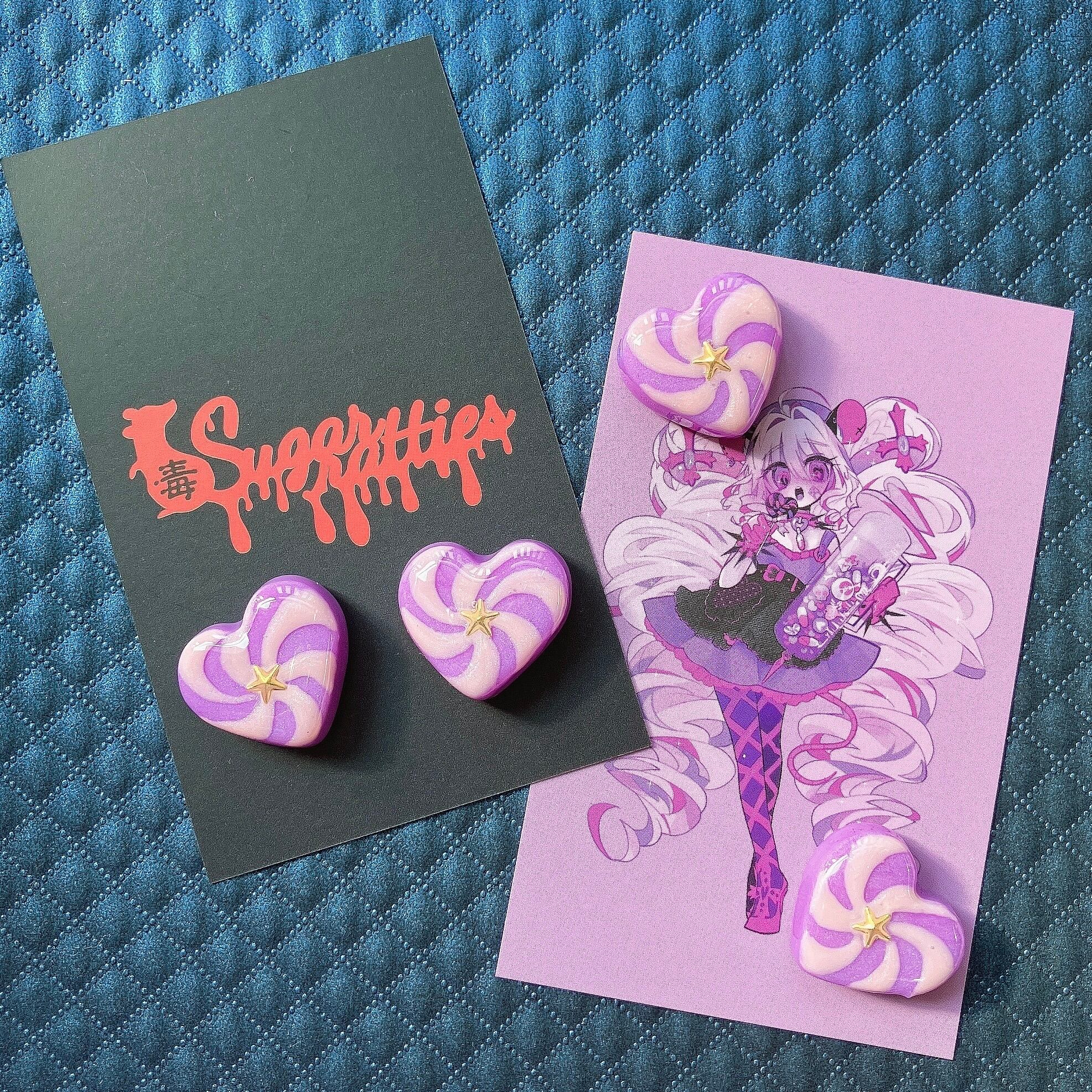 粘土製ハートににぐるぐるキャンディ模様を描いた新色は、微細な偏光パールを練り込んだパープルをベースに、パールピンクでハートをペイントしました。