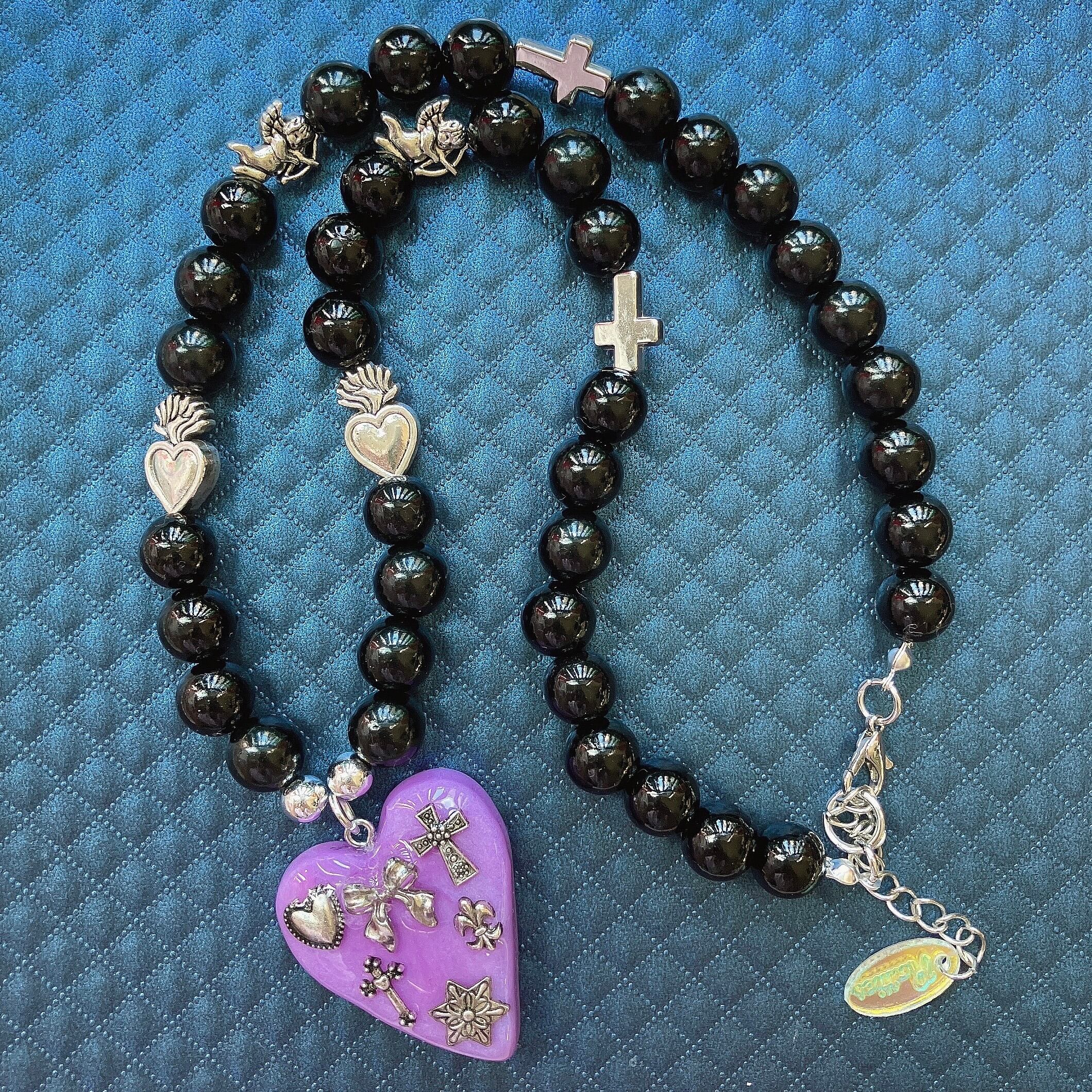 微細な偏光パールを練り込んだパープルハートにシルバーの装飾、10mm玉の間にはコラソンや天使、十字架のデザインビーズをポイントで挟みました。