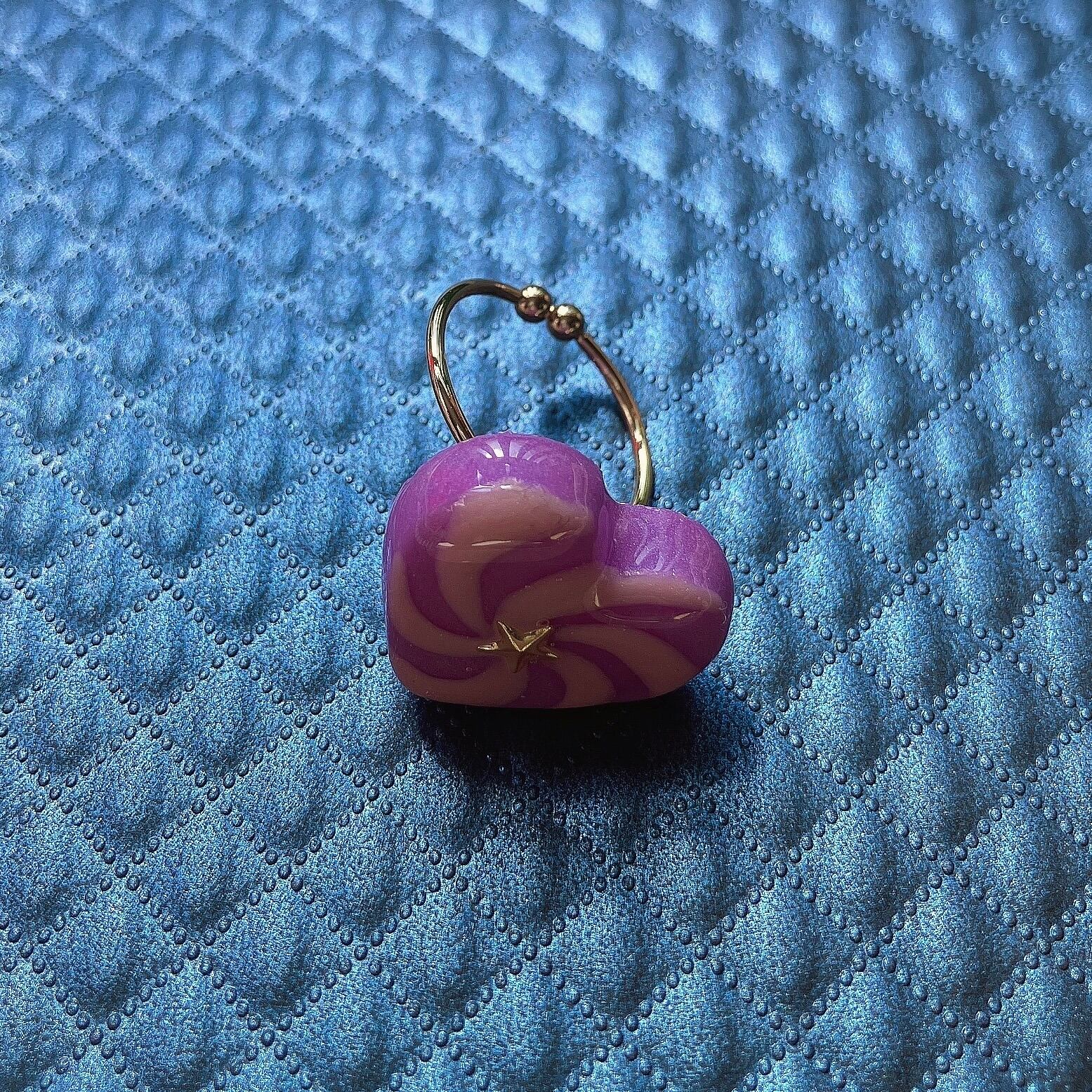 粘土製ハートににぐるぐるキャンディ模様を描いた新色は、微細な偏光パールを練り込んだパープルをベースに、パールピンクでハートをペイントしました。