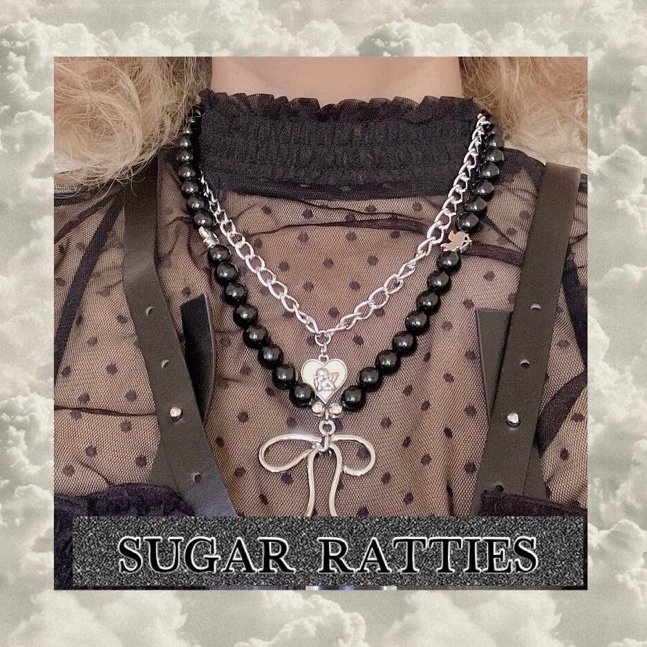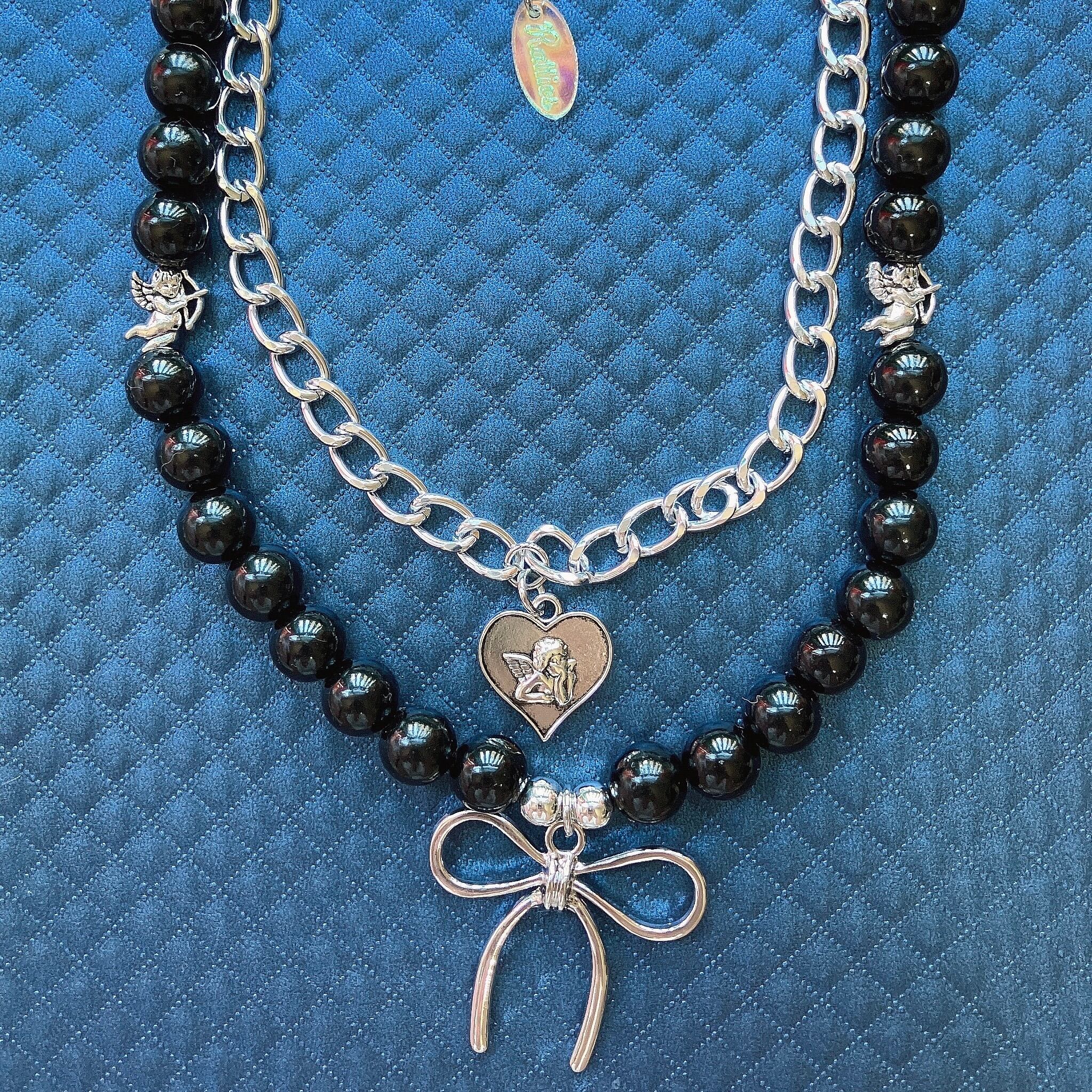 リボンが揺れる10mm玉ネックレスと、天使の型押しハートチャームが揺れるチェーンネックレスの二連タイプです。