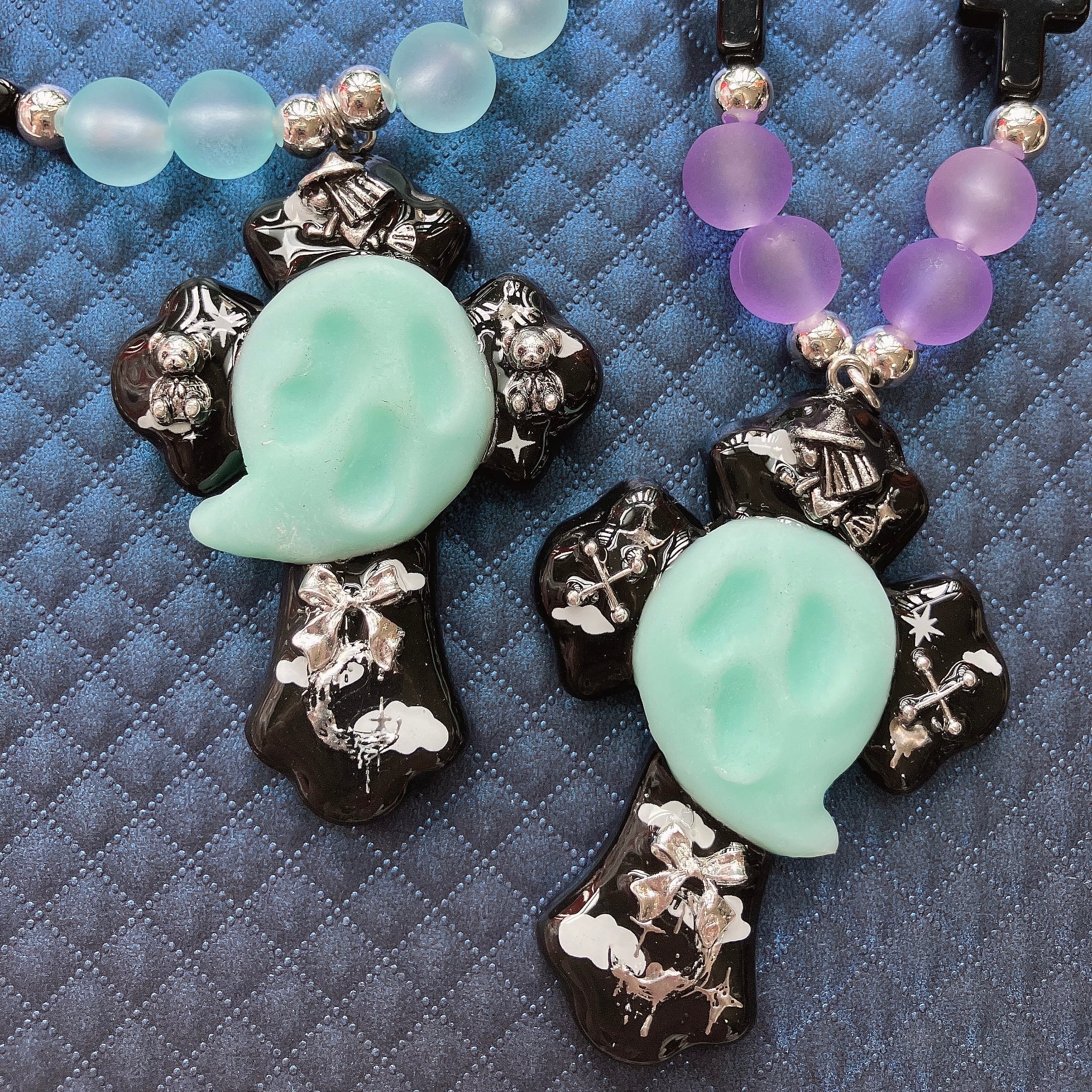 十字架はレジンコーティングしておりますが、おばけは粘土の質感を残したかった為レジンコーティングしておりません。水濡れや高温に、十分ご注意ください。