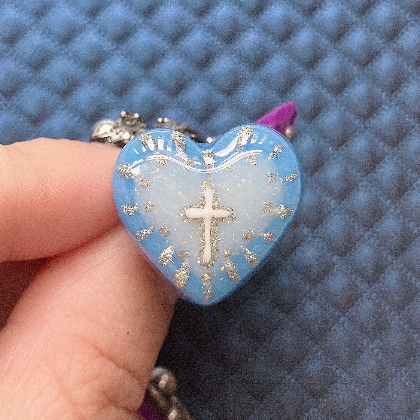 粘土で作ったハートに後光がさす十字架を描いた御守り的アイテムです。
