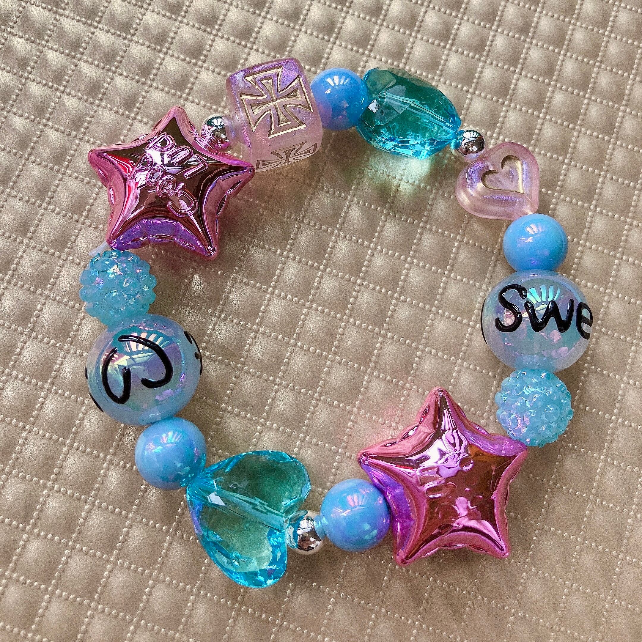 星型バルーンや宝石みたいな多角ハートなどを連ねたビーズブレスレット。