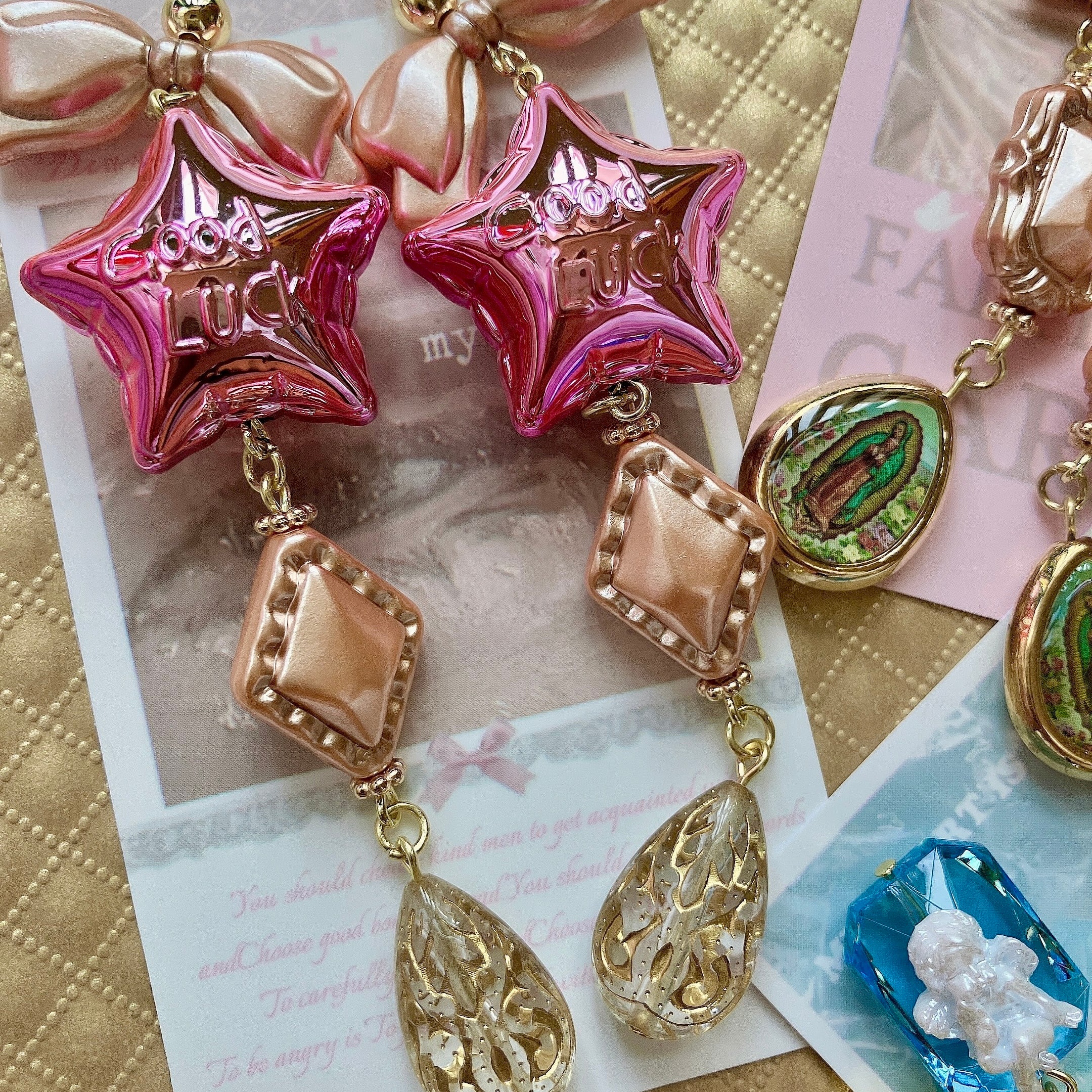 そんな方にもおすすめな、メタリックピンクの星型バルーン風ビーズをメインに、アンティーク調のビーズを連ねたイヤーアクセサリー。