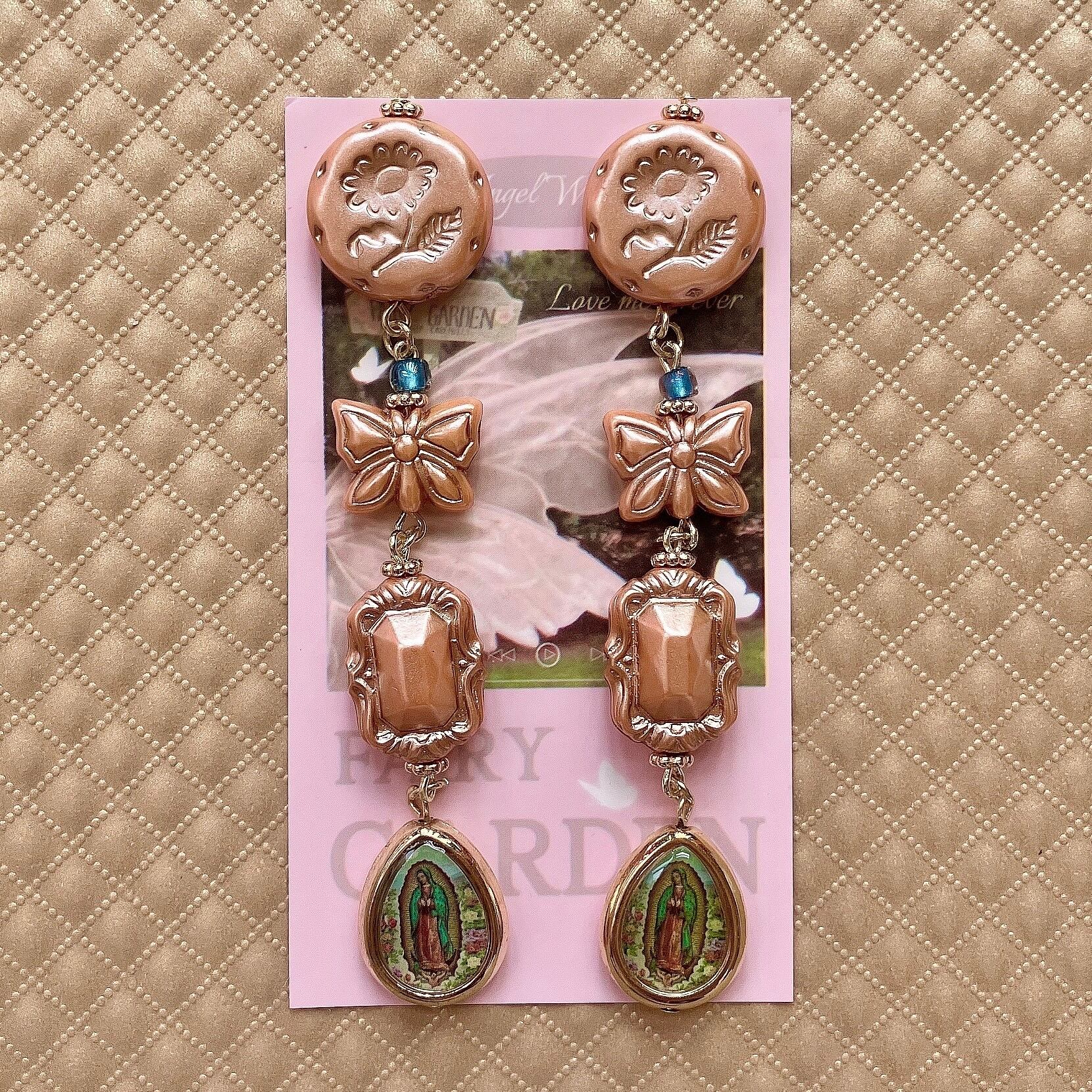 落ち着いたヌードカラーの3種のアンティーク調ビーズたちと、マリア様が描かれたしずく型ビーズのイヤーアクセサリー。