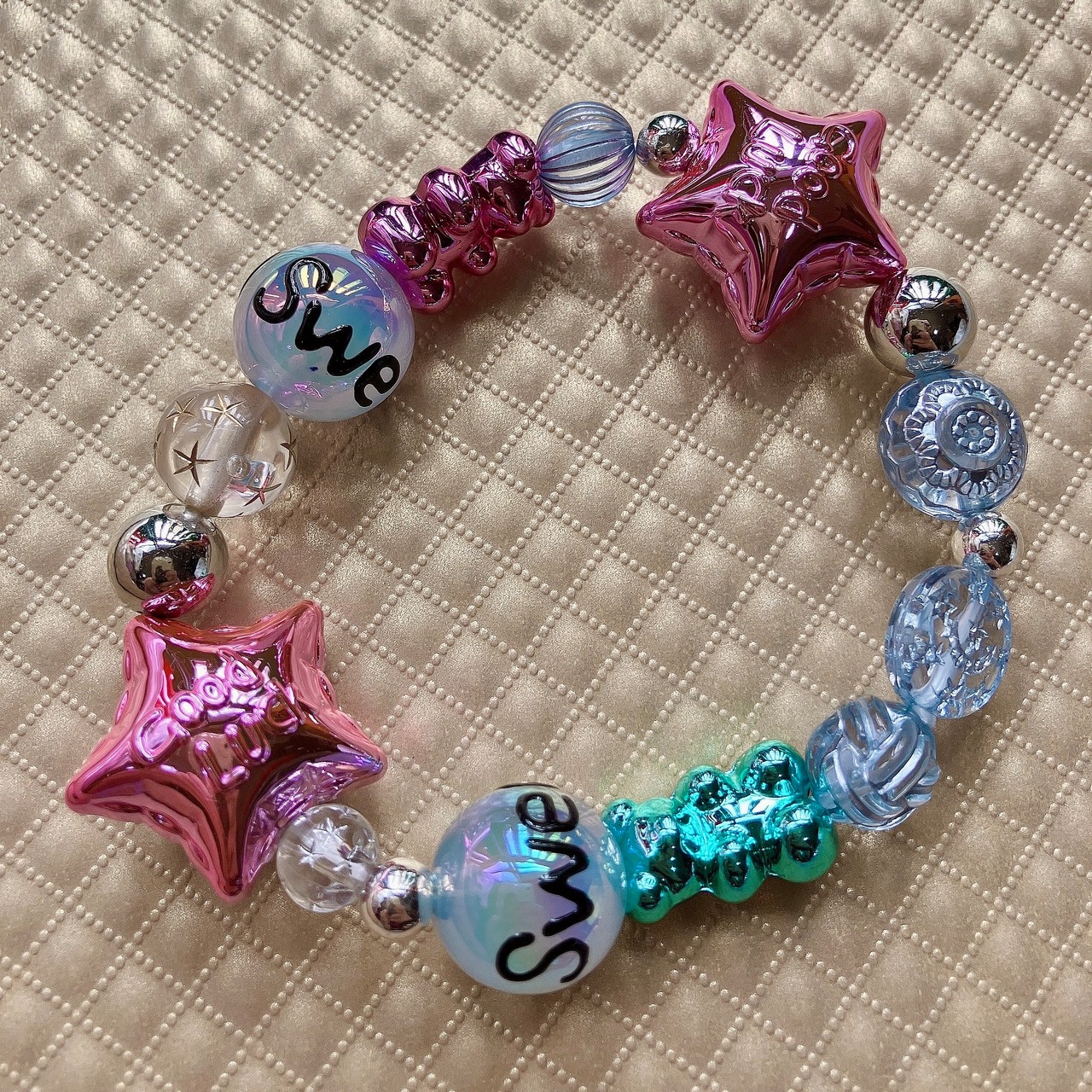 星型バルーンや宝石みたいな多角ハートなどを連ねたビーズブレスレット。