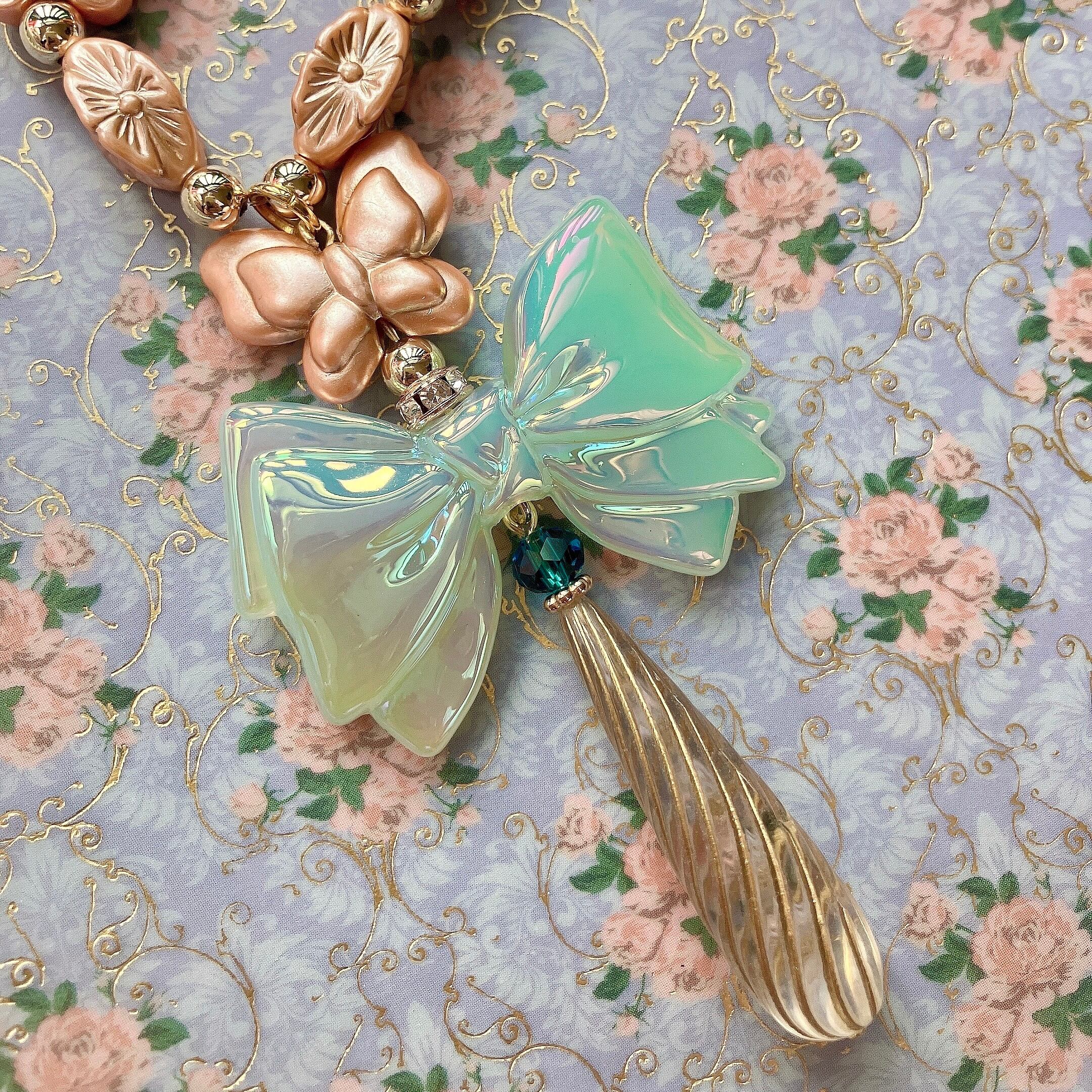 オーロラに艷めくリボンに、氷柱のようなビーズを垂らしたトップが印象的なネックレス。