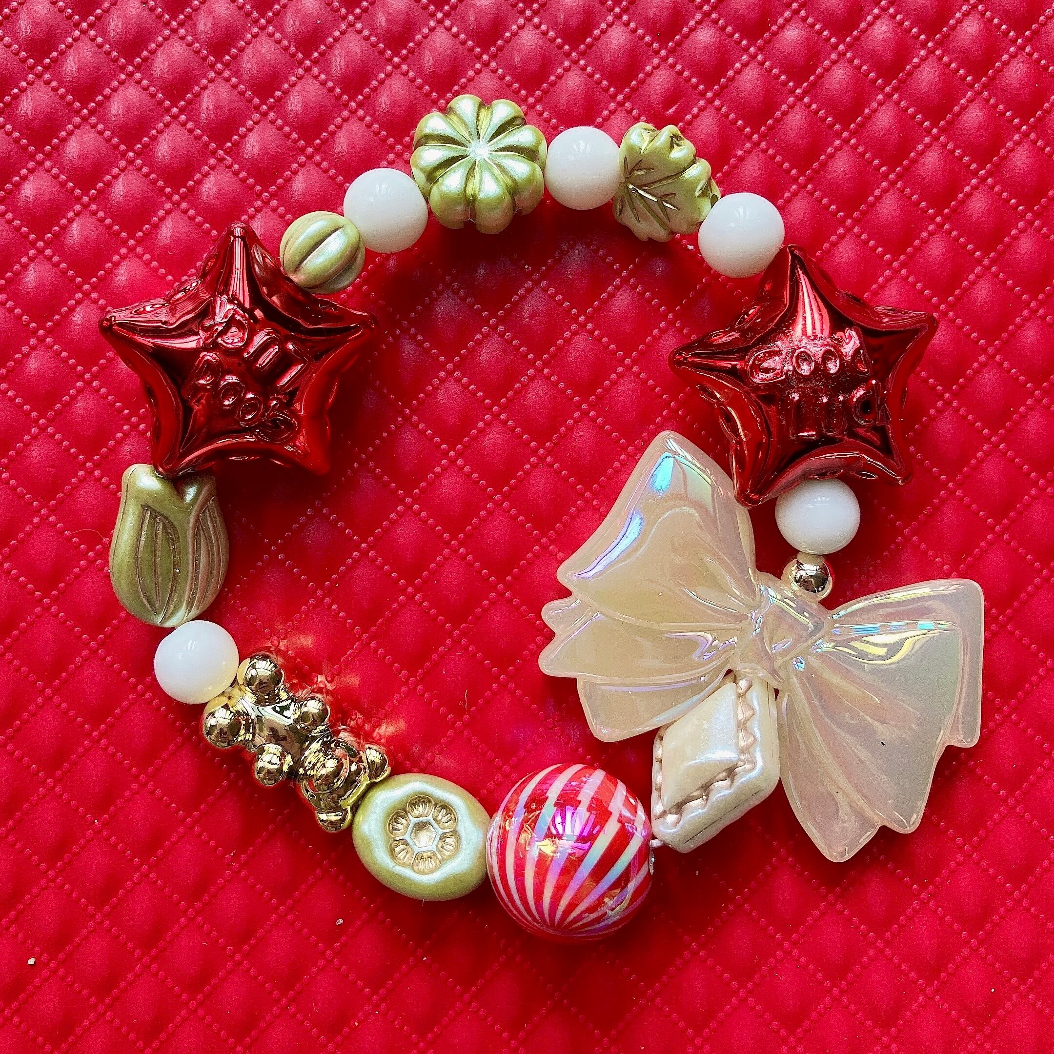 星型バルーンやピカピカなリボン、ピスタチオカラーのビーズなどを連ねたクリスマスリースみたいなビーズブレスレット。