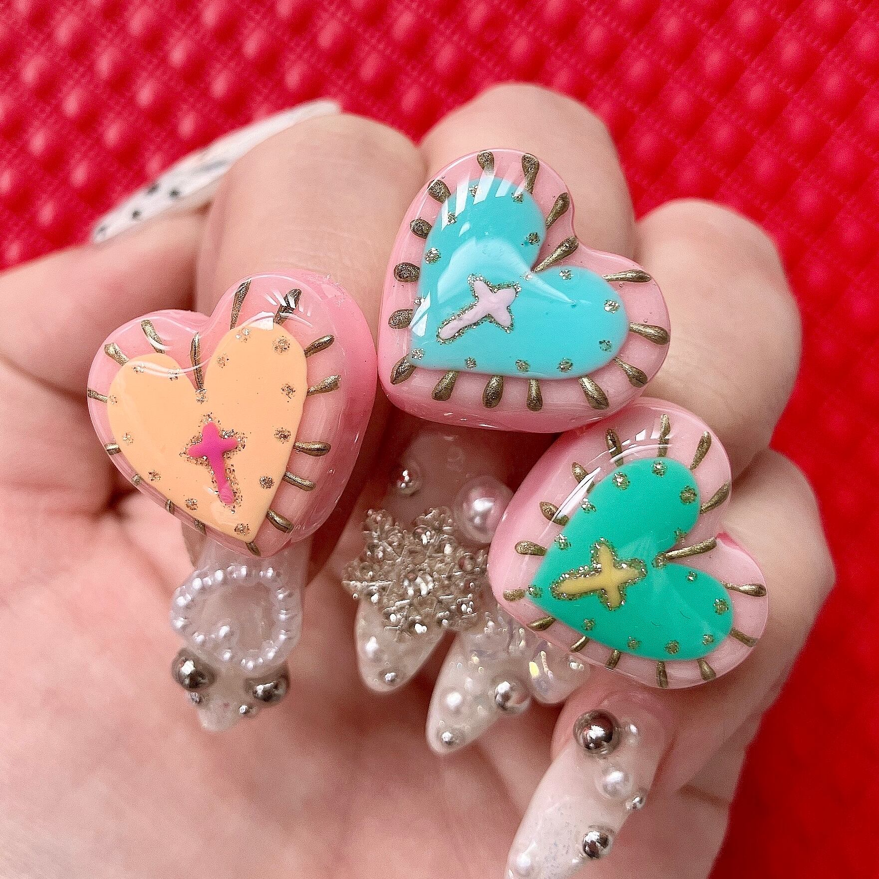 粘土で作ったハートに後光がさす十字架を描いた御守り的アイテムです。