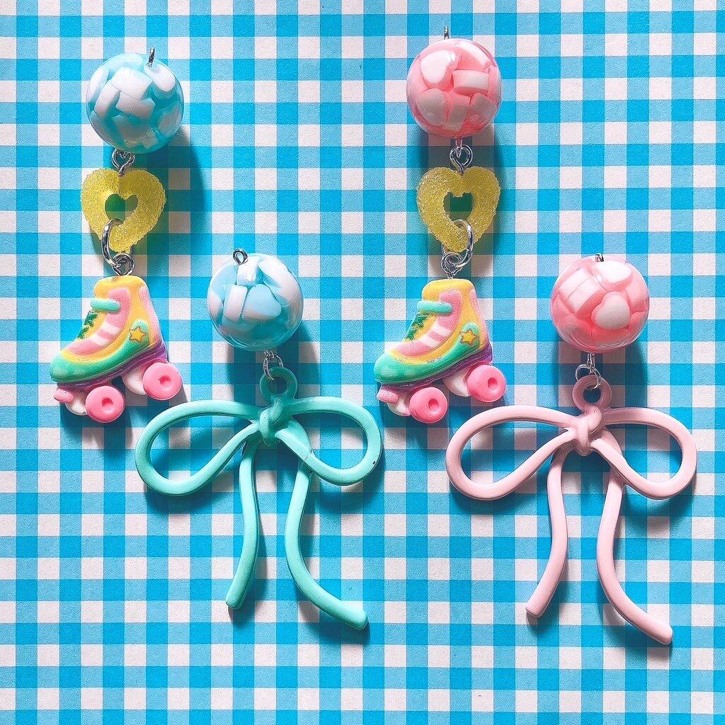 ローラーシューズやリボンが揺れる、左右デザイン違いの遊び心あるイヤーアクセサリー。