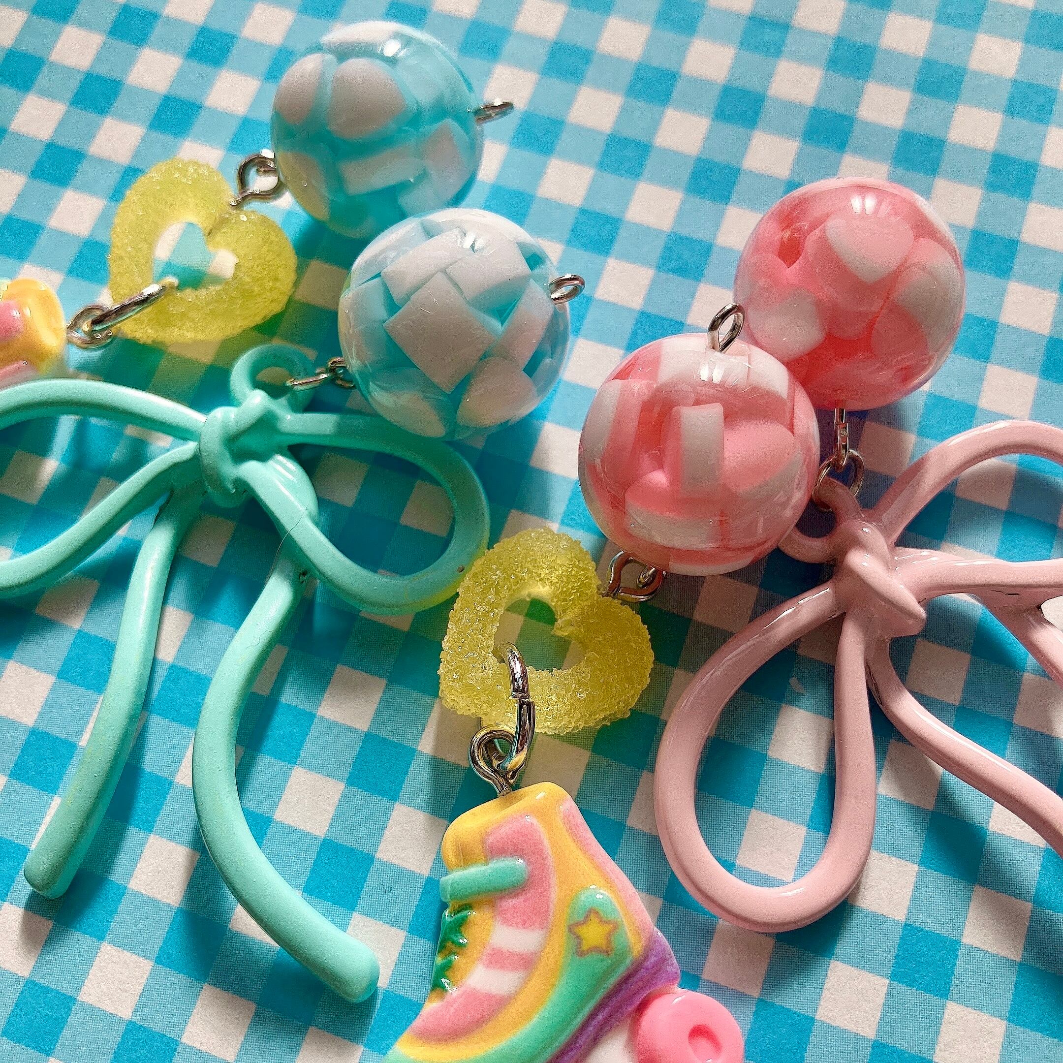 ハートが埋め込まれた飴玉みたいなビーズや、ハートのシュガーグミみたいなパーツ、全体的にファンシーなカラーリングが魅力的♡