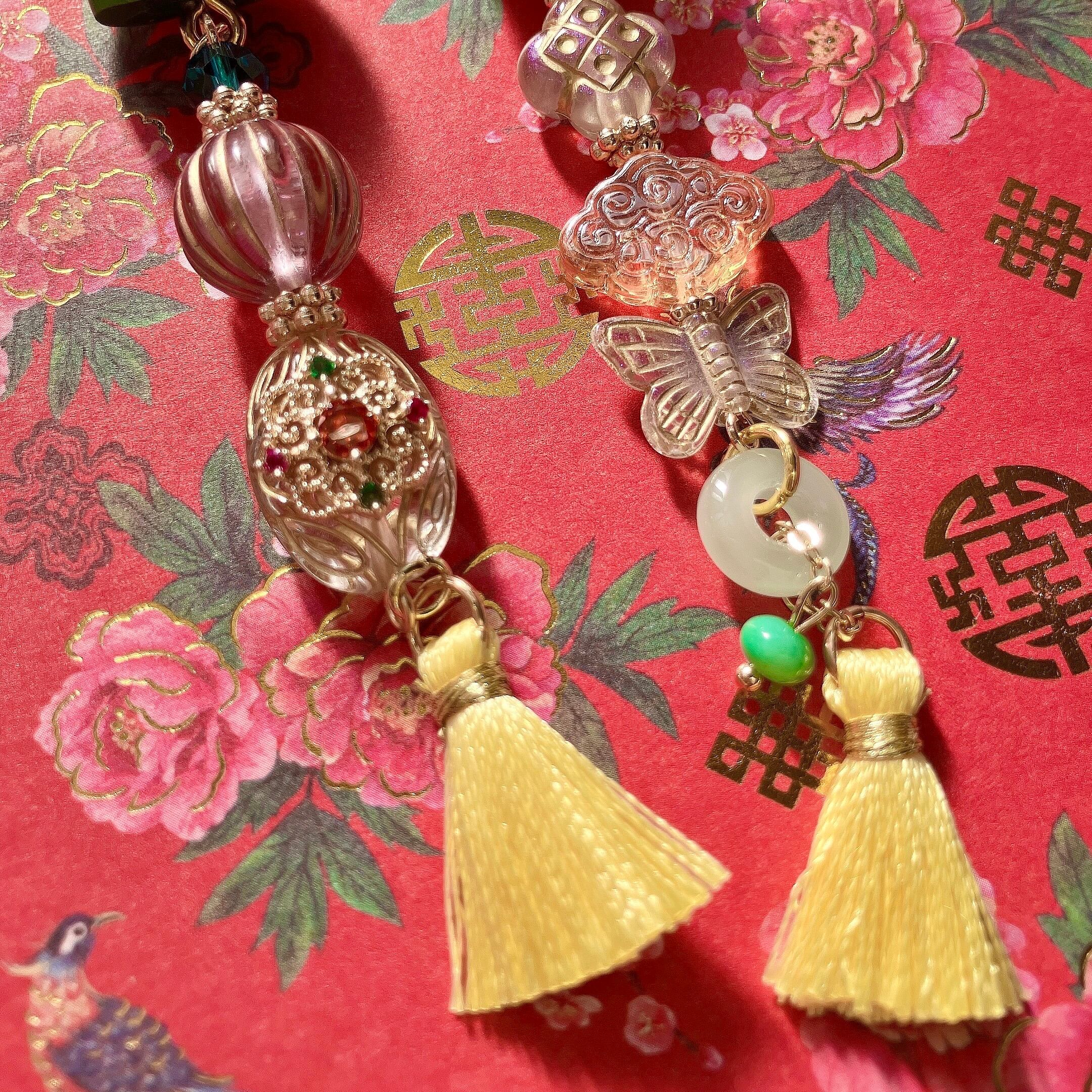 タッセルを使用したものや、ランタン・燈籠をイメージしたもの、人気の桃や雀牌など、色とりどりのパーツを組み合わせた耳飾りをお楽しみください。