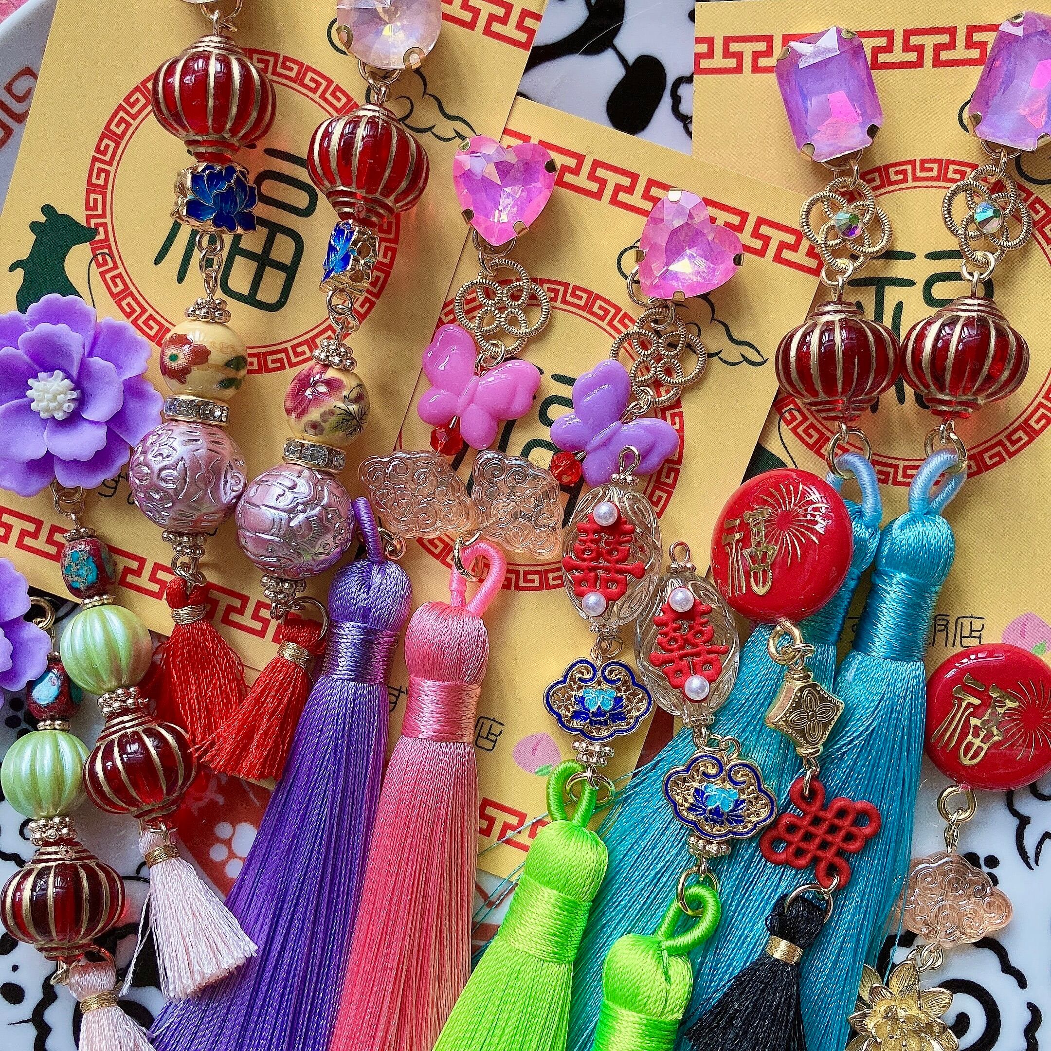タッセルを使用したものや、ランタン・燈籠をイメージしたもの、人気の桃や雀牌など、色とりどりのパーツを組み合わせた耳飾りをお楽しみください。
