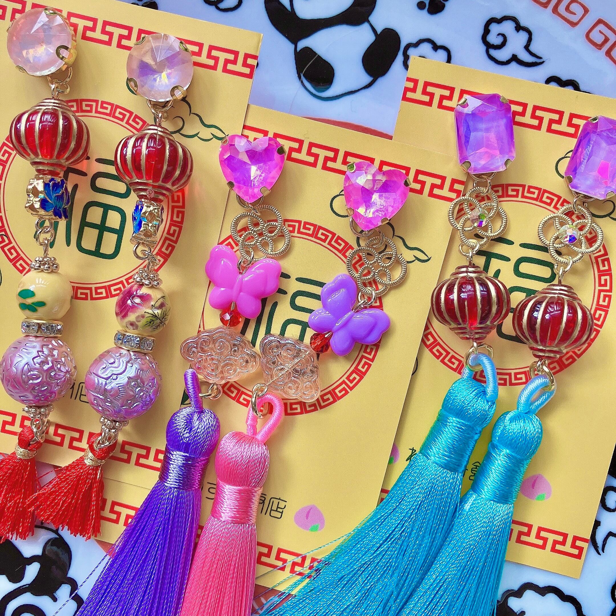 タッセルを使用したものや、ランタン・燈籠をイメージしたもの、人気の桃や雀牌など、色とりどりのパーツを組み合わせた耳飾りをお楽しみください。