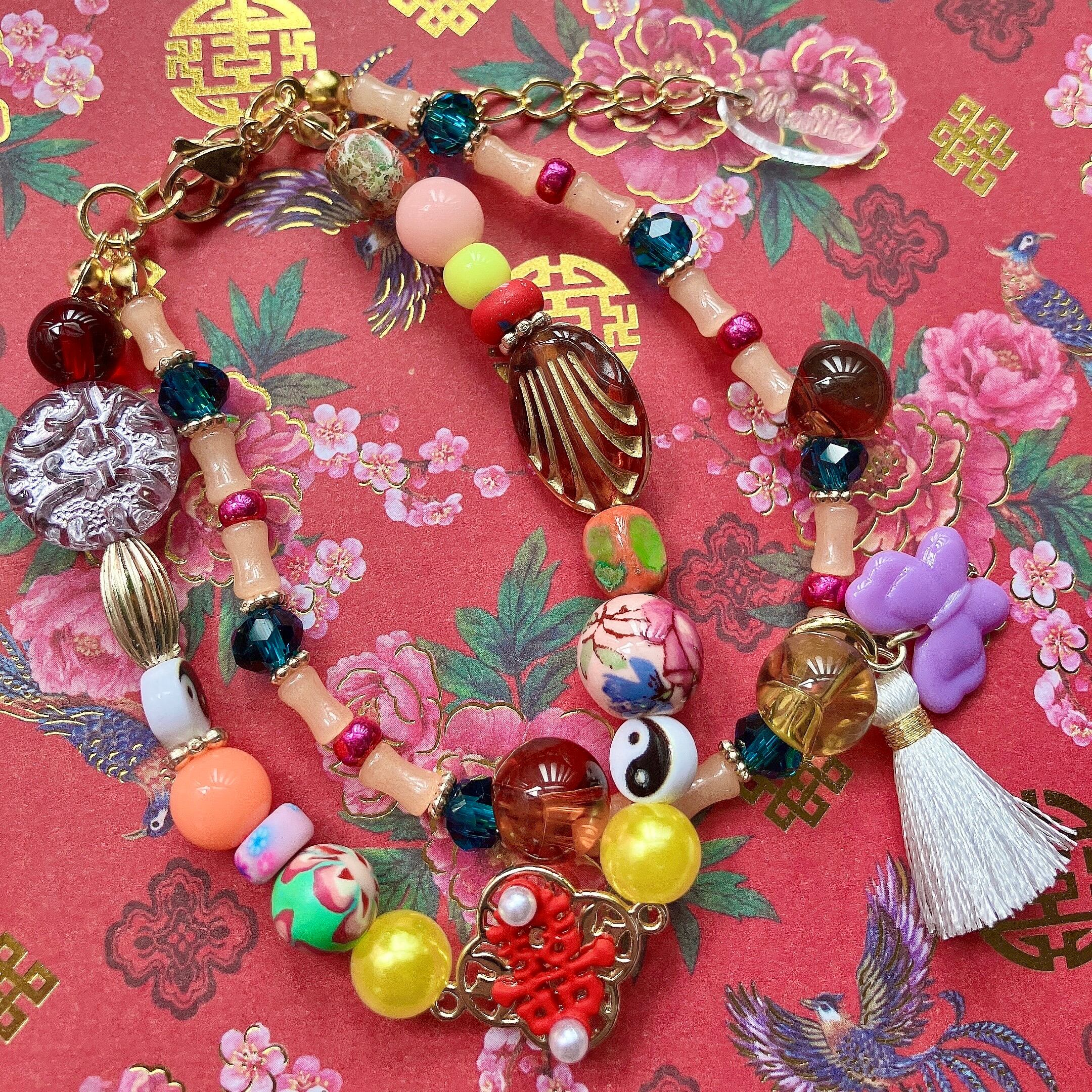 SUGAR RATTIESのチャイナライン、ねずみ飯店より、タッセルが揺れるダブルハピネスチャームの二連ブレスレットです。