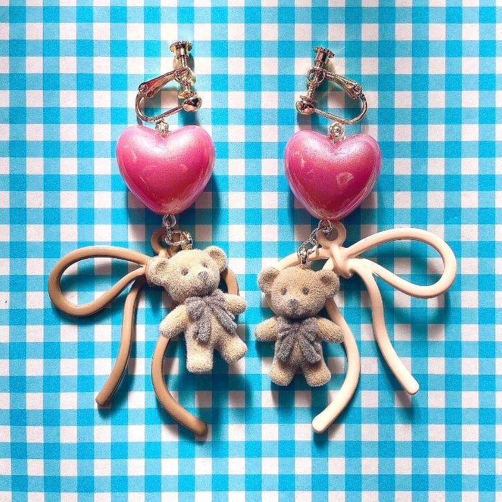 フロッキー素材のテディベアが、ハートとともに気持ちを伝えてくれるようなイヤーアクセサリーです。