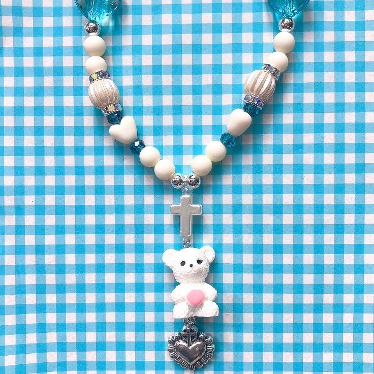 差し色には水色、しろくまがおすわりしたトップもロングデザインにしました。