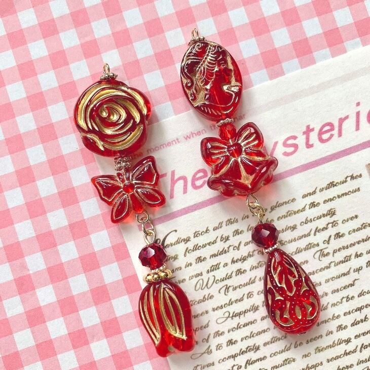 赤いアンティーク風デザインビーズを連ねた恋煩いなピアス/イヤリングです♡