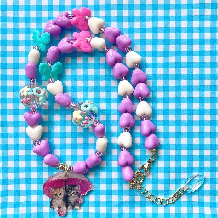 ぷっくりとしたハートのビーズに、ペイント風ビーズや蝶々のビーズを所々加えたビーズネックレスは、仲良く相合傘をする子猫たちが転写されたアクリルパーツが揺れ動きます♡
